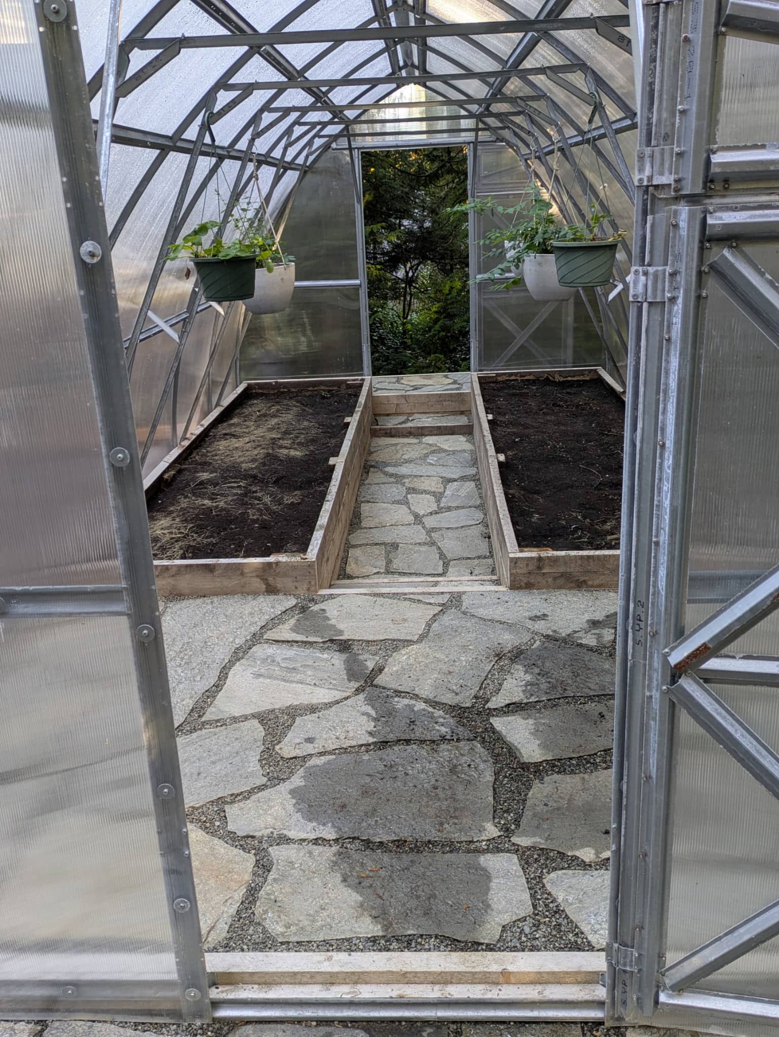 After having ordered our green house 3 and a half years ago and having it sit in it's packaging for all this time we finally finished putting it together. We have now completed the assembly of the green house, built the cedar garden beds that the green house is screwed into and finished the slate inside. We have a sitting area with steps down into the garden bed area.